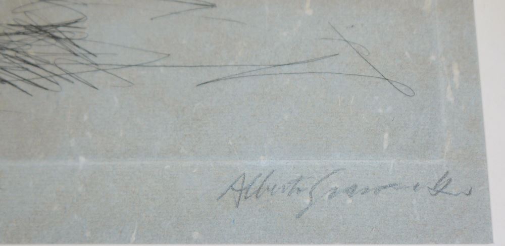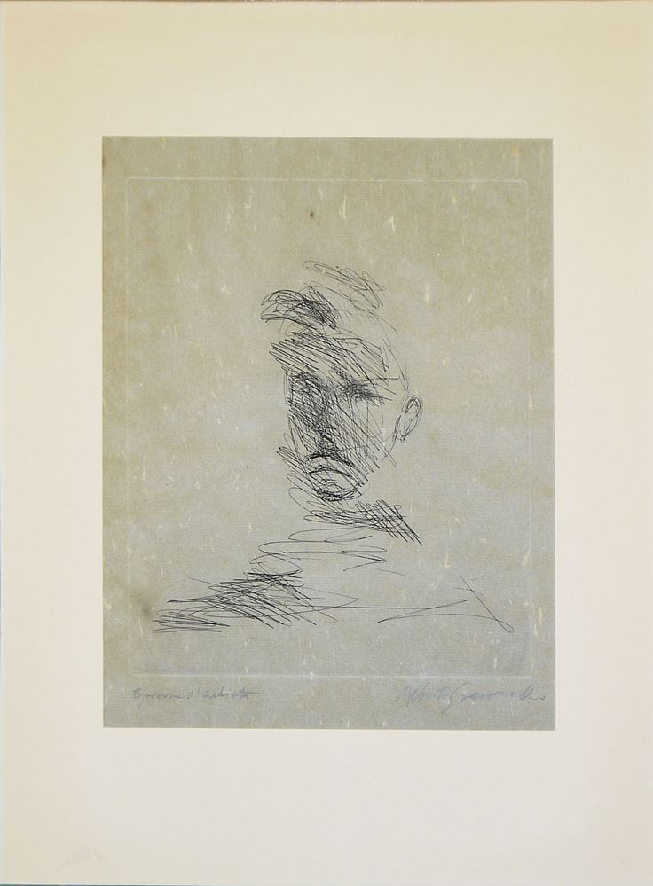 Alberto Giacometti, 1901 Borgonovo - 1966 Chur, Schweizer Bildhauer, Maler und Grafiker der Moderne, der seit 1922 hauptsächlich in Paris lebte und arbeitete. Giacometti gehört zu den bedeutendsten Bildhauern des 20. Jahrhunderts, hier: Arthur Rimbaud, Radierung auf blau-grauem Büttenpapier, 29 x 24 cm, signiert, bezeichnet Épreuve d'artiste, gebräunt, leicht fleckig, Lust S. 139 Nr. 175, unter P.p.