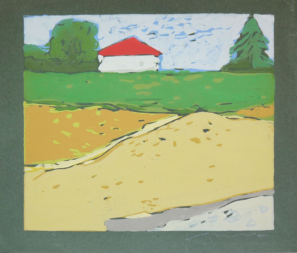 Klaus Fußmann, Landschaft mit Haus, signierter Farblinolschnitt von 2015