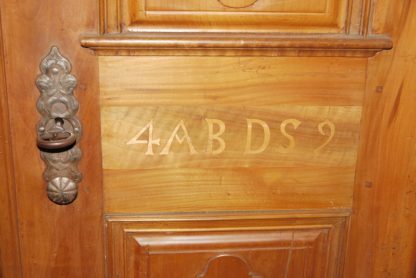 Kirschbaum massiv, Originalzustand, 2-türig, kassettiert, Kopf getreppt, reich verzierte Beschläge, originales Schloss, H 201, B 210, T 74 cm, Gebrauchsspuren