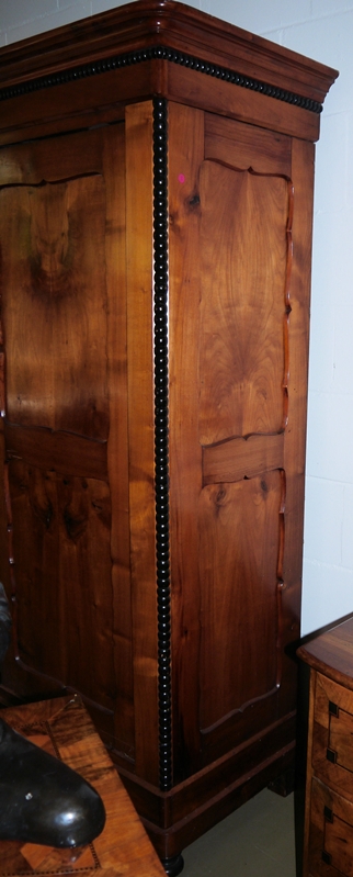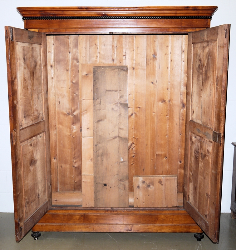 Biedermeierschrank um 1850/60 Kirschbaum massiv, Brezelfüllungen, schwarzer Perlendekor, Inneneinteilung komplett, H 206, B 165, T 67 cm Vorbesichtigung ab Samstag, 4. September nach telefonischer Absprache (+49 621 31 62 57) im Hofgut, Der Hohe Weg zum Rhein 34, 68307 Mannheim-Kirschgartshausen, Lieferung und Aufarbeitung sind möglich