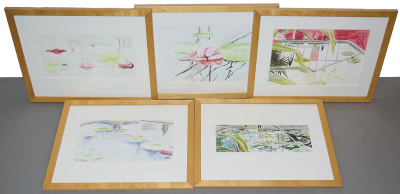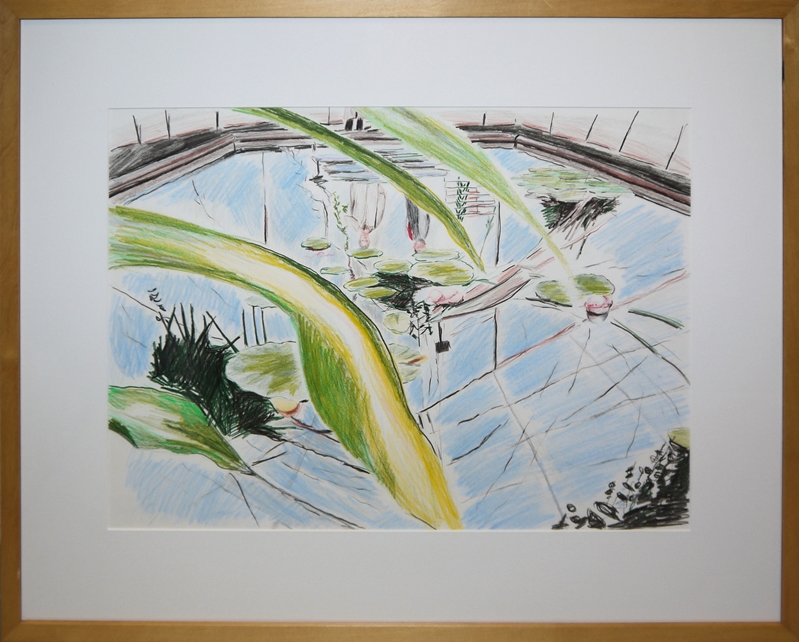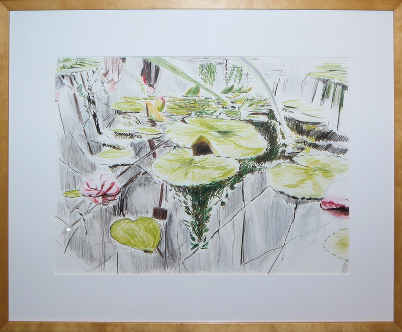 Esther Horn, *1965 Bensberg, 1986-1992 Studium an der Kunstakademie Münster; Auslandsstudium an der Cité Internationale des Arts Paris und Goethe-Institut Kuala Lumpur. Gründerin des Berliner Kunstprojekts montanaberlin. Hier: Seerosen, Teiche, Spiegelungen im Wasser, Botanische Gärten, insgesamt 18 Zeichnungen auf Papier, Buntstift/Kohle/Kreide, Größen von 10,5 x 29 cm bis 41 x 58 cm, alle unter P.p. u. Glas gerahmt (Inv. Nr. 218-235)