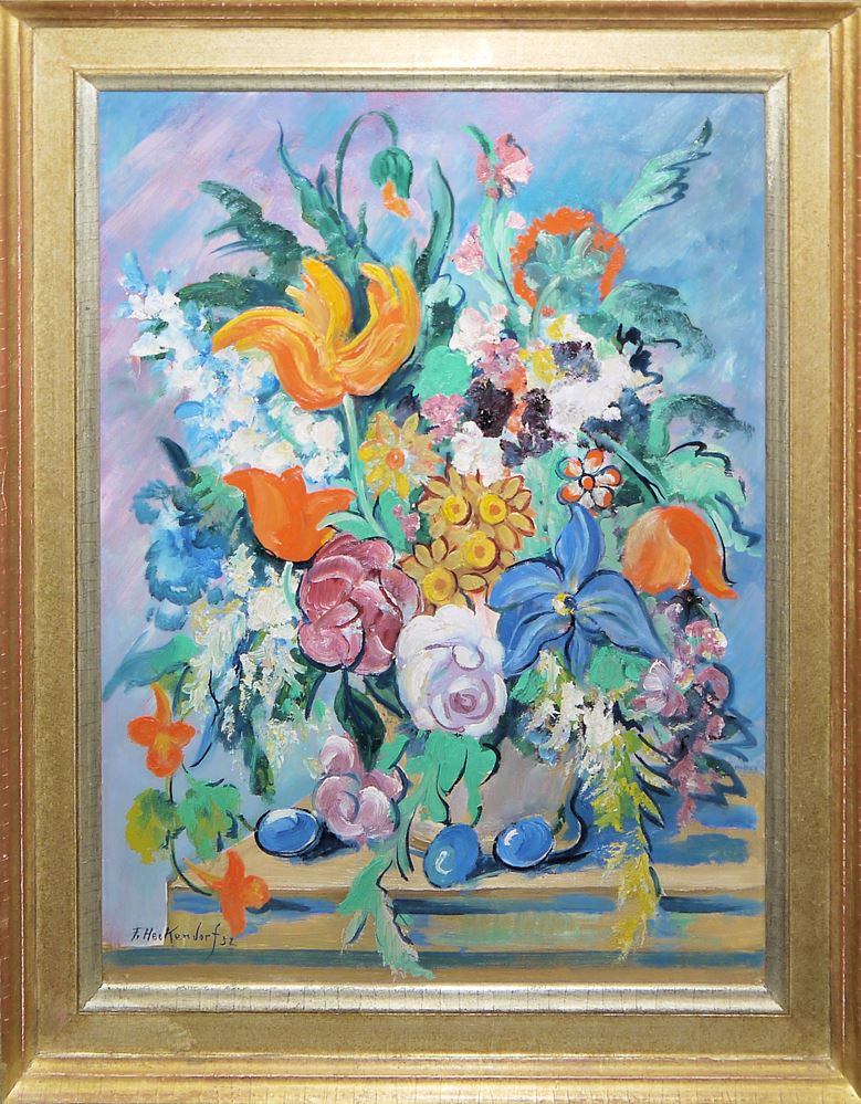 Franz Heckendorf, Expressive Blumen, Ölgemälde, gerahmt Friedrich Heinrich Franz Heckendorf, 1888 Schöneberg - 1962 München, deutscher Maler und Grafiker, hier: Expressive Blumen, Öl/Platte, 65 x 50 cm, l. u. sign. u. dat. 52, gerahmt Zum Künstler: 1905 bis 1908 studierte Franz Heckendorf an der Berliner Kunstgewerbeschule und an der Berliner Akademie der Künste. 1917 trat er dem Deutschen Künstlerbund bei. Von 1916 bis 1918 gehörte er dem Vorstand und der Jury der Berliner Sezession an. Eine umfangreiche Sonderausstellung in der Kestner-Gesellschaft in Hannover im Frühsommer 1918 gab einen Überblick über die erste Schaffensperiode des jungen Künstlers seit 1912. Während der Weimarer Republik galt Heckendorf als „Maler der Republik“ und „Liebling der sogenannten Gesellschaft“, seine Bilder fanden Eingang in die Sammlungen prominenter demokratischer Politiker. 1937 wurde in der Nazi-Aktion „Entartete Kunst“ Werke Heckendorfs aus dem Stadtbesitz von Berlin, der Nationalgalerie (Kronprinzen-Palais) Berlin, der Anhaltischen Gemäldegalerie Dessau, dem Museum Folkwang Essen, dem Kestner-Museum Hannover und dem Kaiser-Friedrich-Museum Magdeburg beschlagnahmt. Während der Zeit des Nationalsozialismus wurde er zu zehn Jahren Zuchthaus verurteilt, nachdem er von der Deportation in Vernichtungslager bedrohten Berliner Juden zur Flucht in die Schweiz verholfen hatte. Nach dem Krieg wirkte Heckendorf erst an der Akademie der bildenden Künste Wien, anschließend in Salzburg, dann bis zu seinem Tod in München.