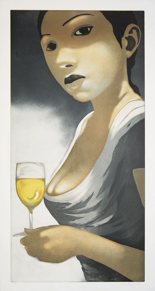 Johannes Hüppi, *1965 Baden-Baden, Frau, Kellnerin mit Weißweinglas, Farbaquatinta-Radierung, 98,5 x 46 cm, signiert, datiert 2005, bezeichnet EA,