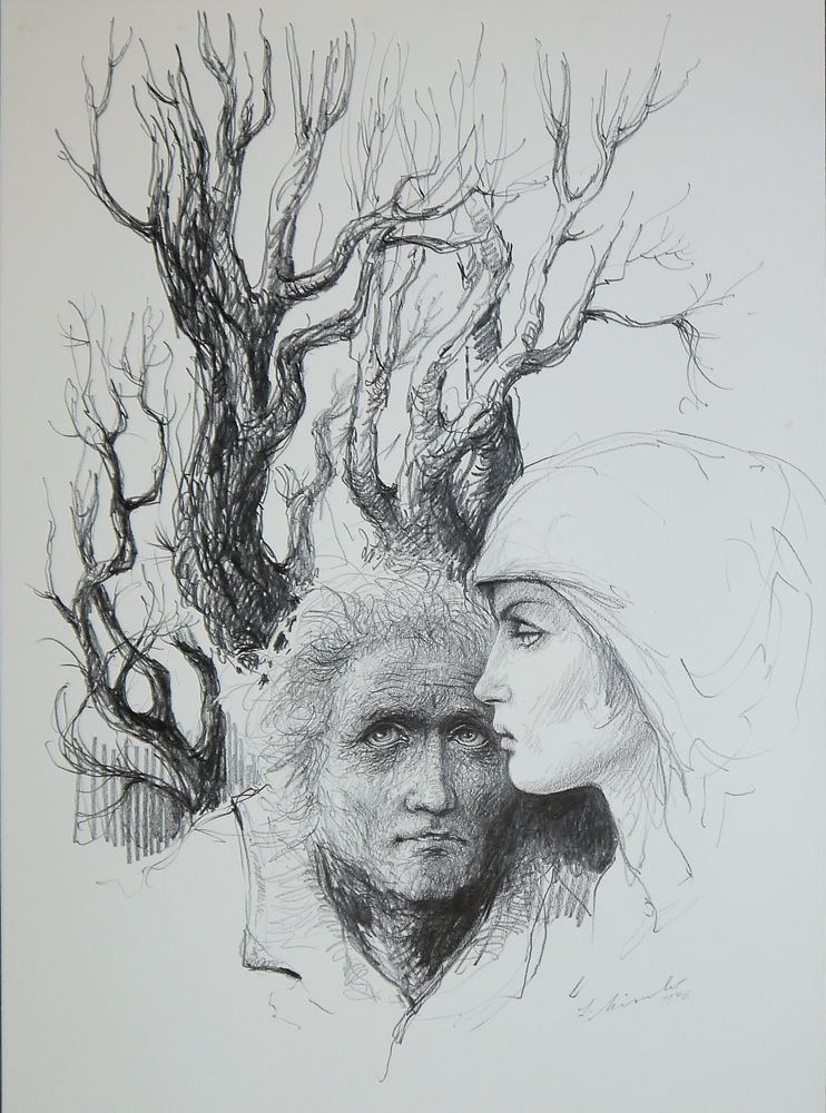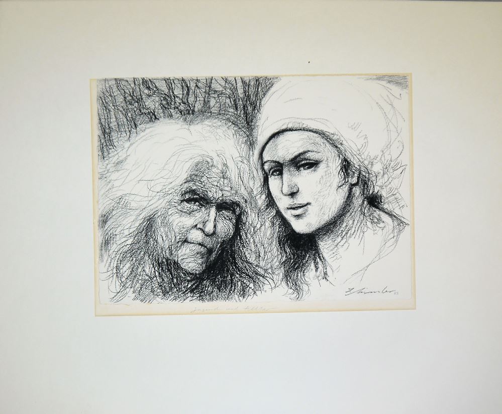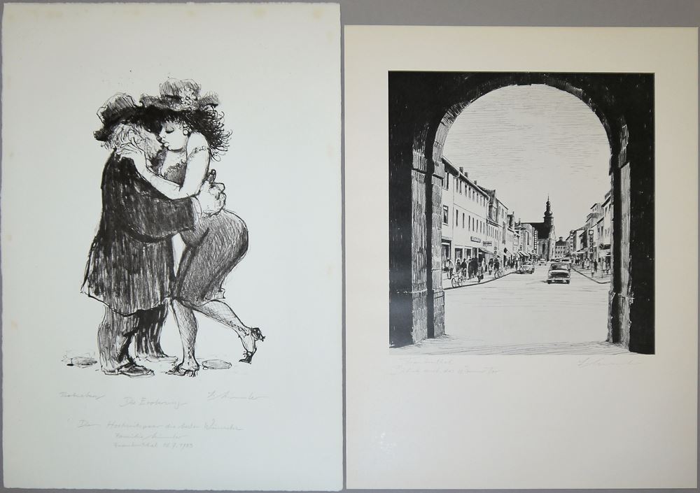 Irmgard Himmler, 1927 - , Nichte von Heinrich Himmler, "Jugend und Alter", Kohlezeichnung, 27 x 40 cm, signiert, datiert (19)83; Jung und Alt mit Baum, Kohlezeichnung, 60 x 42 cm, signiert, datiert 1976; "Die Eroberung", Lithographie, 53 x 38,5 cm, signiert, betitelt, mit Widmung, datiert 1983, Probeabzug; "Frankenthal - Blick durch das Wormser Tor", Offset, 30,5 x 30,5 cm, signiert, bezeichnet, o. Rahmen
