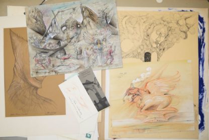 Werner Holz, 1948 Grünstadt - 1991 Ludwigshafen am Rhein, deutscher Maler des "Phantastischen Realismus", hier: Umfangreicher Sammlungs-Nachlass mit 8 Gemälden (40 x 32 cm bis 120 x 95 cm), meist gerahmt, 14 hauptsächlich größerformatige Zeichnungen und Aquarelle sowie 12 sign. Druckgraphiken (Radierungen, Lithographien)