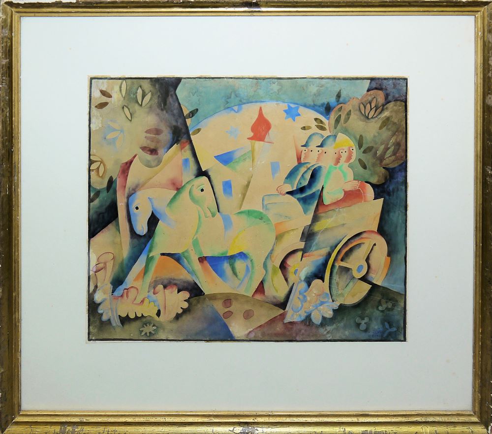 Béla Kádár, 1877 - Budapest - 1956, ungarischer Maler und Zeichner, hier: Zwei Männer und zwei Frauen sitzen auf einer Kutsche, welche von zwei Pferden gezogen wird. Die figürliche Szene wird von Bäumen und Pflanzen eingefasst, im Hintergrund ist ein Kirchturm dargestellt, der Malstil erinnert an die der Blauen Reiter, Aquarell/Papier, 34 x 42,5 cm, das Papier ist vorwiegend im unteren Bereich knickfaltig (geglättet) und hat einen großen restaurierten Einriss an der rechten Seite. Linke obere Ecke wasserfleckig und restauriert sowie linke Seite fehlende kleine Stelle ersetzt und übermalt, oberhalb der blauen Sterne überarbeitet. Im Ganzen eine sehr schöne Zeichnung mit einer kräftigen Farbigkeit, unter Glas gerahmt
