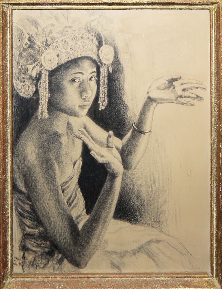 Franz Kienmayer, Balinesische Tänzerin, Zeichnung & Balinesin füttert Affen, Zeichnung, gerahmt, mit kleinen monographischen Katalogen