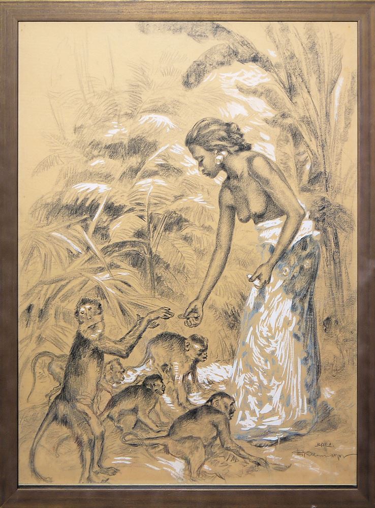 Franz Kienmayer, 1886 Wien - 1963 Baden-Baden, österreichischer Maler und Illustrator sowie Orientalist, hier: Sitzende Tänzerin in Tracht, Kohlezeichnung, 64 x 49 cm, sign. u. bez., hinter Glas im Goldstuckrahmen, beil. kl. Katalog & Balinesin füttert Makaken mit Bananen, Kohlezeichnung, weiß gehöht, ca. 64 x 49 cm, sign. u. bez., hinter Glas im Holzrahmen, beil. kl. Katalog