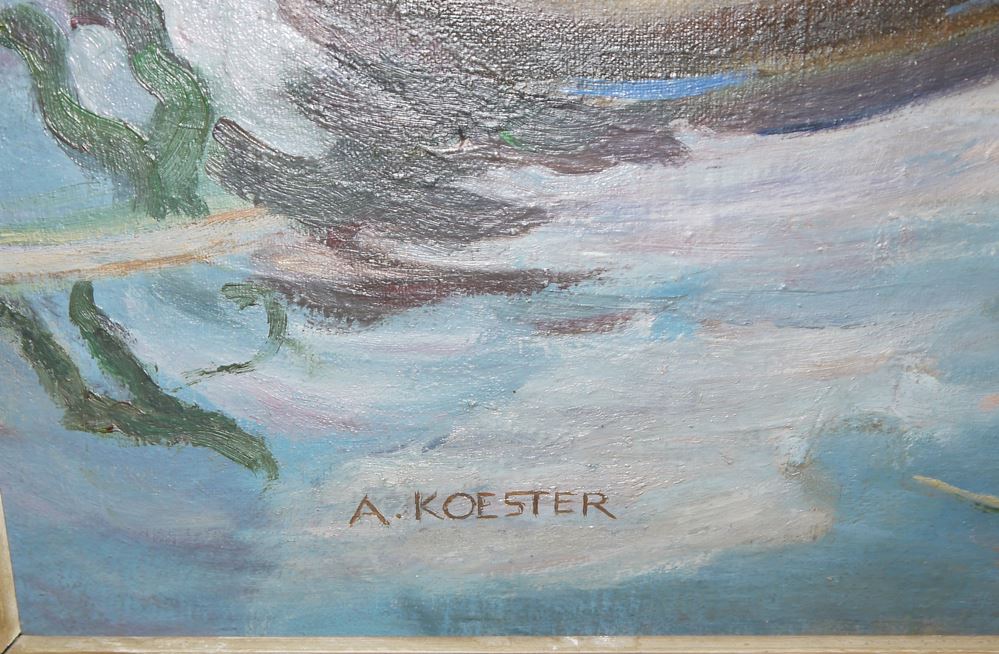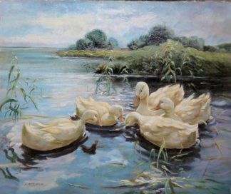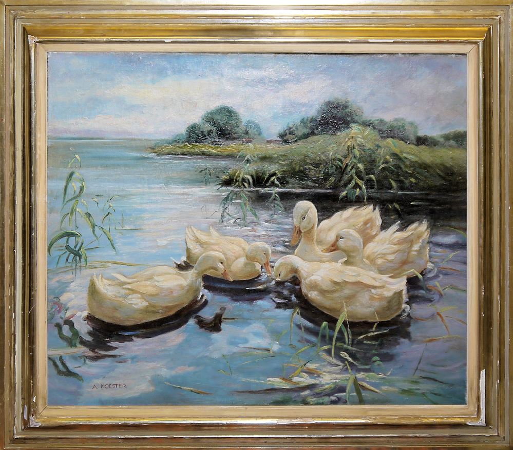 Zum Künstler: Alexander Koester begann 1885 sein Kunststudium an der Karlsruher Akademie. Nach dem Ende seines Studiums 1896 zog er nach Klausen und widmete sich ganz der Malerei. Dabei entstanden viele Landschaftsgemälde und er entdeckte die Ente als sein Studienobjekt, als er das Entenvolk seines Schwiegervaters auf dessen Grundstück beobachtete. Sein Entenmotiv malte er in einer großen Variationsbreite. Aufgrund seiner Faszination für Enten studierte er ihre Anatomie und kannte bald auch ihr Verhalten. So wurde er bald auch zu einem Experten für Entenrassen und Züchtungen. Die Ente als Bildnis erfreute sich in kürzester Zeit großer Beliebtheit. Sein Werk zeigt eine konsequente Entwicklung von einer noch sehr realistischen, detaillierten Darstellung in den 1890er Jahren zu einer immer freieren, großzügigeren Malweise der Impressionisten. Seit Alexander Koester im Jahre 1899 in Berlin seine ersten in der Landschaft eingebetteten Entenbilder präsentierte, kennt man ihn auch unter dem Namen „Enten-Koester“. Auch Kaiser Wilhelm II. war von Koesters Enten angetan und erwarb 1900 das Gemälde „Abendsonne“. 1907 kaufte auch der italienische König eins seiner Werke, „Enten in Ruhe“.