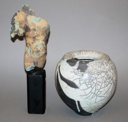 Hannelore Hilgert, *1946, Ausbildung plastisches Gestalten an der Europäischen Akademie für Bildende Kunst in Trier, Aktzeichnen u.a. bei Bildhauer Reinhold Petermann, zahlr. Ausstellungen, Terrakottaplastik männlicher Torso, bronzierende matte Glasur, auf Eisensockel, H 24 cm, Gesamthöhe 39 cm, monogrammiert, beil. Rechnung Galeriehaus Atelier, Ladenburg 1996 und signierte Karte; Andrea Müller, * 1955 Heidelberg, Studium an der Fachhochschule für Gestaltung in Wiesbaden, Schwerpunkt Keramik und Bildhauerei, seit 1980 freischaffende Künstlerin in Aschaffenburg, ovoide Vase mit einziehendem Rand, auf Schulter gerillt, grauschwarzer Ton, Raku-Technik, H 22 cm, am Boden monogrammiert u. dat., beil. Rechnung Galeriehaus Atelier und Broschüre