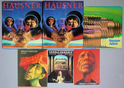Rudolf Hausner, 1914 Wien - 1995 Mödling, Friedhelm Häring, 'Labyrinth und Billard", "Das Leben zwischen Angst und Aggression zwischen Schoß und Phallus am Beispiel von zwei Bildern des Wiener Malers Rudolf Hausner", Gießen 1991, mit Widmung, Einband gering berieben ~ Gerd Lindner (Hrsg.), "Rudolf Hausner - Adam und Anima", Ausstellungskatalog Panorama Museum Bad Frankenhausen, Leipzig 1994 ~ C. Sylvia Weber (Hrsg.), Rudolf Hausner 1914-1995, Ausstellungskatalog Museum Würth 1996, Künszelsau-Gaisbach 1996, Einband gering bestoßen ~ "Rudolf Hausner - Adam", Belser Verlag Stuttgart, 1974, Einband an den Kanten berieben und leicht beschädigt ~ 2x Hans Holländer, "Hausner", Werkmonographie Edition Volker Huber, Offenbach am Main 1985, Einbände gering bestoßen