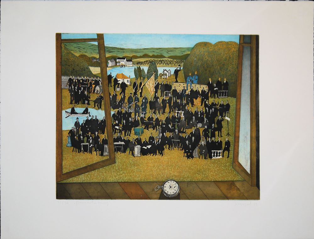 Diether Kressel, 1925 Düsseldorf - 2015 Hamburg, deutscher Maler, Zeichner und Grafiker, hier: "Preisverleihung", Farbradierung, 39 x 49 cm (Gesamt: 56 x 76 cm), num. 36/70, bez., sign. u. dat. (19)69 & Atelierszene mit einer üppigen, blonden Frau auf einer Leinwand, Farbradierung, 59 x 39 cm (Gesamt: 76 x 56 cm), num. 4/75, sign. u. dat. (19)71