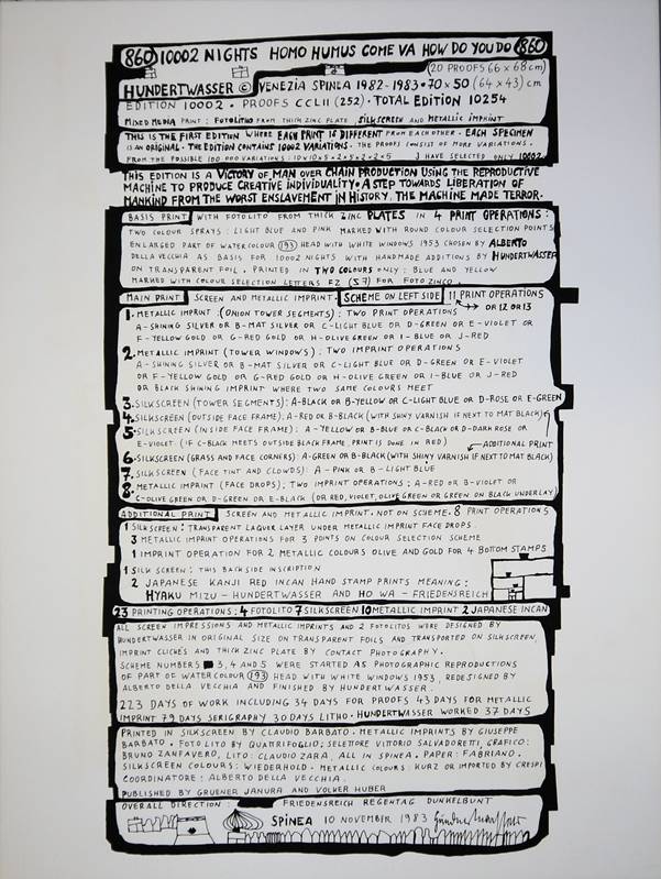 0204-Friedensreich Hundertwasser, “Homo Humus come va 10001 nights”, signierte Farblithographie mit Folienprägung, Venedig 1982-84, dazu 2 Broschüren