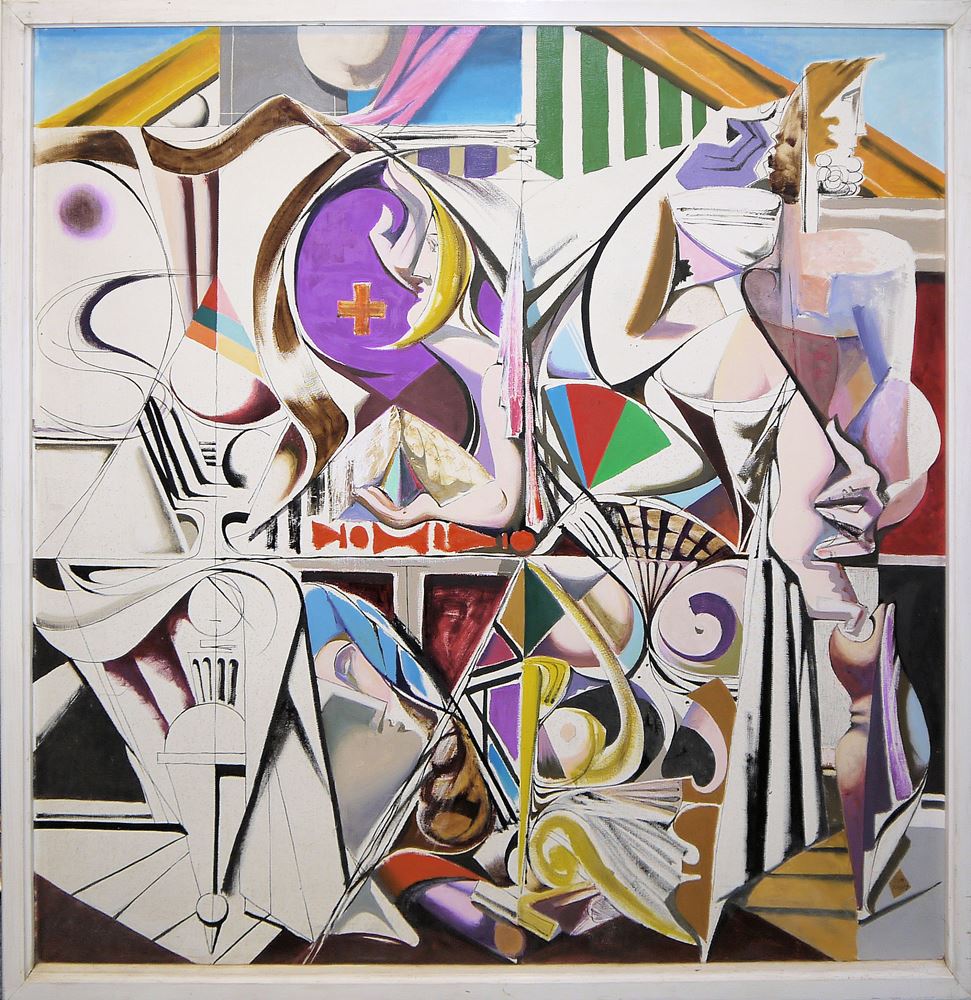 Karl Lorenz Kunz, "Interieur mit Kreuzchen", großes Ölgemälde von 1957, gerahmt Karl Lorenz Kunz, 1905 Augsburg - 1971 Frankfurt am Main, "Interieur mit Kreuzchen", Öl/Tusche/Platte, 131 x 135,5 cm, signiert und datiert 1957, WV 259, verso Etikett, im weißen Rahmen Zum Künstler: Maler des Surrealismus in der Nachkriegsmoderne. 1921 bewarb sich Kunz erfolglos an der Münchner Kunstakademie. Er bildete sich autodidaktisch weiter, ging als Externer zum Aktzeichnen in die Akademie und war Gast an der Kunstschule von Hans Hofmann in Schwabing. Kunz setzte sich mit der Moderne auseinander, vor allem mit Paul Cézanne und Kandinsky. Ab 1927 lebte und arbeitete er in Berlin. Unter den Nationalsozialisten wurde seine Kunst als entartet eingestuft und er erhielt ein Malverbot. Nach dem Krieg schloss er sich der Münchner „Neuen Gruppe“ an und schloss Freundschaft mit Willi Baumeister und Franz Roh. Bis zu seiner Berufung an die neu gegründete Staatliche Schule für Kunst und Handwerk (Saarbrücken), 1947, nahm er an zehn Ausstellungen teil, u. a. an der Allgemeinen Deutschen Kunstausstellung 1946 in Dresden. Auf der Surrealismus-Schau im deutschen Pavillon auf der Biennale in Venedig 1954 wurde Kunz mit vier Gemälden gezeigt, neben Klee und Schlemmer. Er war Mitglied der Neuen Darmstädter, der Pfälzischen und der Frankfurter Sezession. Seine Werke befinden sich u.a. in der Neuen Nationalgalerie in Berlin, der Bayrischen Staatsgemäldesammlung München, Städel Museum Frankfurt u.v.m.