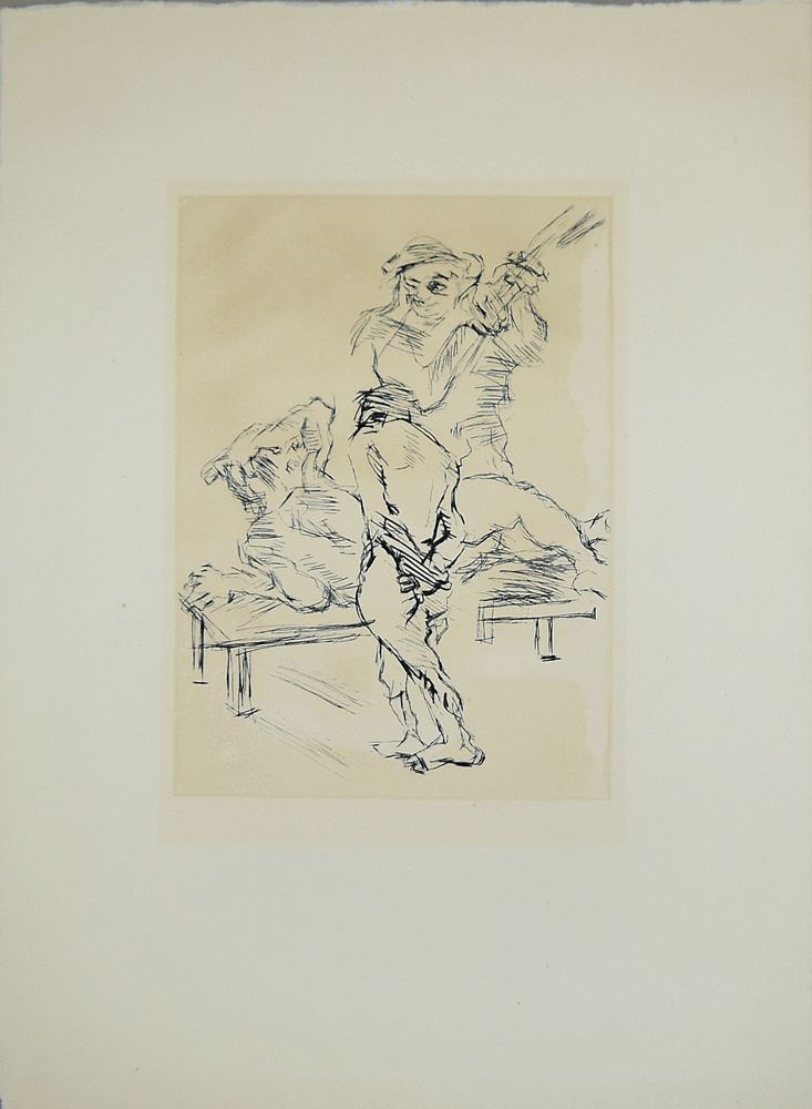 Oskar Kokoschka, Prügelszene, aus: "Die Frösche" des Aristophanes, Radierung von 1967/68 Oskar Kokoschka, 1886 Pöchlarn - 1980 Montreux, bedeutender österreichischer Maler, Grafiker, hier: Prügelszene, Dionysos und Xanthias werden wechselweise von Aiakos verprügelt, Kaltnadelradierung, 26,5 x 20,5 cm, Blattgröße 48,.5 x 38 cm