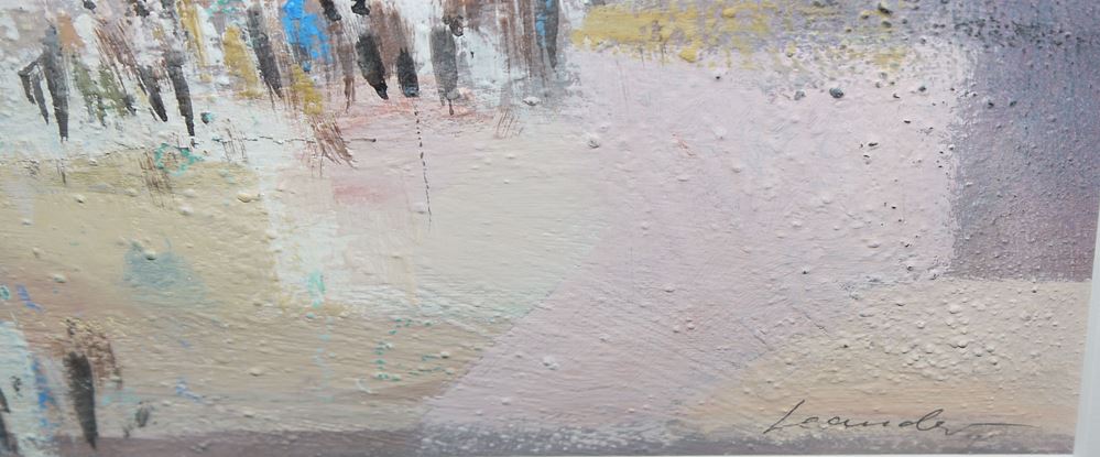 Leander, Stadtbild mit Menschen vor einem historischen, großen Kirchengebäude, Ölgemälde in edler Galerierahmung Leander (Pseudonym), *1949 Altenberge, deutscher Maler, hier: Menschen vor einem großen Kirchengebäude, Öl/Sand/ Karton ca. 68 x 48 cm, r. u. sign., unter P.partout edel gerahmt (Gesamt: 100 x 80 cm) Zum Künstler: Von 1975 bis 1981 studierte Leander Malerei an der Münchener Kunstakademie. Nach Abschluss seines Studiums, lebte er zunächst als freischaffender Künstler in Ägina Griechenland. Im Jahr 1983 kehrte Leander nach Deutschland zurück und lebt seitdem als freischaffender Maler bei Münster. Leander ist bekannt für seine eindrucksvollen, visionären Landschaften. Seine Gemälde zeigen keine realen Orte, sondern imaginäre, ideale Welten, in denen Natur und Kultur harmonisch verschmelzen. Leander nutzt hochwertige Materialien und traditionelle Techniken, neben den üblichen Malmaterialien kommt auch ungewöhnliches Material wie Sand und die Collage zum Einsatz. „Was“ er darstellt und „wie“ er es umsetzt macht Leander zu einem der unverkennbarsten Maler der Gegenwart.