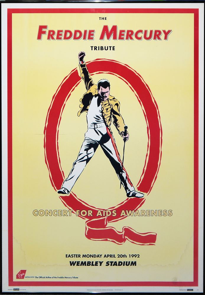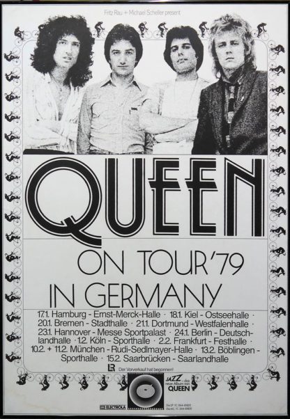Fritz Rau + Michael Scheller present "Queen on Tour `79 in Germany" - 17.1. Hamburg bis 15.2. Saarbrücken, Originalplakat, unterer Rand, kaum sichtbar etwas wasserfleckig und in den Ecken Reißzweck-Löcher, 84 x 58 cm, gerahmt & "The Freddie Mercury Tribute - Concert for AIDS awareness", Easter Monday April 20th 1992 Wembley Stadium, unterer Rand etwas wasserfleckig, 90 x 63 cm, gerahmt