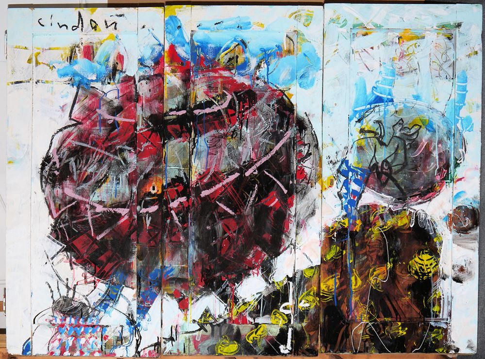 Uwe Lindau, 1950 Groß-Barnitz - 2022 Karlsruhe, Schüler von Markus Lüpertz, hier: Diptychon, abstrakte Malerei, Öl/Holz, je bestehend aus drei verbundenen Schranktüren, teils mit Scharnieren und Schlüssellöchern, 90 x 154 cm und 113 x 143 cm, signiert