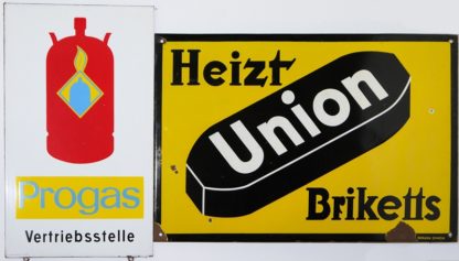 Heizt Union Briketts & Progas, 2 Emailschilder