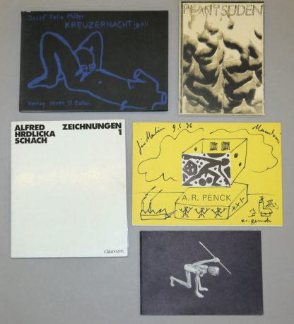 5 Künstlerbücher: A.R. Penck handbemalt // A. Hrdlicka mit Radierung // Hans Scheib mit sign. Radierung // Felix Müller, num. & sign, // Bernd Zimmer & Roland Hagenberg A. R. Penck (1939 Dresden - 2017 Zürich, "Standart-Prä-Standart", Mannheimer Kunstverein 1996, der Einband von Penck handbemalt mit Widmung und Signatur // Alfred Hrdlicka (1928 - Wien - 2009), "Zeichnungen 1", Claasen 1983, eingebunden die Original-Radierung "Blackburne" (Schachspieler) von 1974 // Hans Scheib (*1949), "Frauenfiguren", Mannheimer Kunstverein 1988, mit Radierung "Liegender Frauenakt", num. 11/15, sign. u. dat. 88, auf dem inneren Deckblatt nochmals sign. u. dat. 18.9.88 // Felix Müller (*1969), "Kreuzernachtigall", herausgegeben in Zusammenarbeit mit dem "Raum für aktuelle Schweizer Kunst" Luzern und dem Kunstraum "Filiale" Basel, 444/ 500 nummeriert und vom Künstler signiert u. dat. 83, St. Gallen, Vexer, 1983 // Bernd Zimmer (*1948) & Roland Hagenberg (*1955), "Plantsüden 6/97", mit Textbeiträgen von Allen Ginsberg, Anton Niedermeier, Haikus von Michiyo Namura, Christine Brinck, Gildert Sorrentino (Auszug), und Bildern von Siegfried Anzinger, Birgit Jürgenssen, Tatsumii Orimoto, Alberto Porta (ZUSH), Sakiko Nomura, in sehr guter Erhaltung
