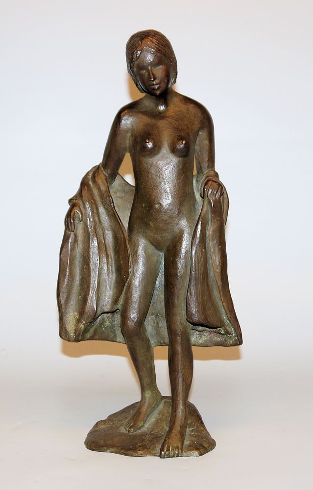 Kurt Moser, Bronzeplastik stehender weiblicher Akt Kurt Moser, Regensburg - 1982 München, Bildhauer u. Maler, Stehender weiblicher Akt mit Tuch, Bronze mit dunkelbrauner Patina, H 37,5 cm, sign., Gießerei-Stempel Strehle Zum Künstler: Moser Studierte an der Akademie der Bildenden Künste in München bei Mayrshofer und später in Wien. Er machte sich zunächst einen Namen als Landschaftsmaler, dann wandte er sich erfolgreich der Bildhauerei zu.