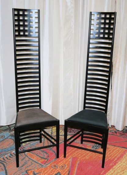 Nach dem Entwurf von Charles Rennie Mackintosh 1903, Paar Stühle aus Eschenholz, schwarz gebeizt, überhohe Rückenlehnen aus leiterähnlichen Sprossen, Sitzflächen gepolstert und bezogen, H 140 cm, Sitz-H 43 cm