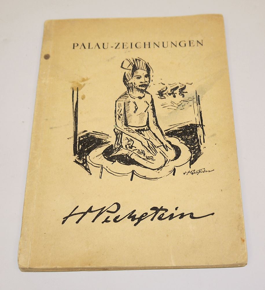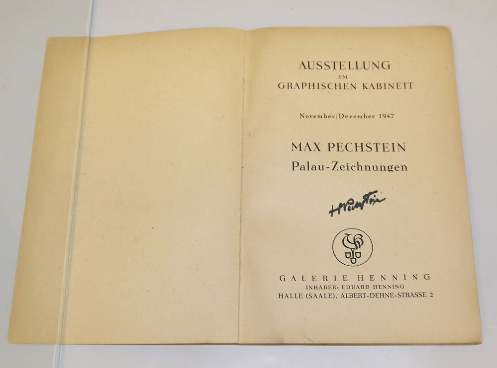 Max Pechstein, 1881 Zwickau - 1955 West-Berlin, bedeutender deutscher Maler, Grafiker und Mitglied der Künstlervereinigung „Brücke“, hier: Ausstellungskatalog Palau-Zeichnungen, Ausstellung im Graphischen Kabinett, Galerie Henning, Halle an der Saale, broschiert, 21 x 14,5 cm, Papier fleckig, zahlreiche Abbildungen u.a. Selbstbildnis (Holzschnitt) mit handschriftlicher Signatur Pechsteins auf dem Titelblatt.