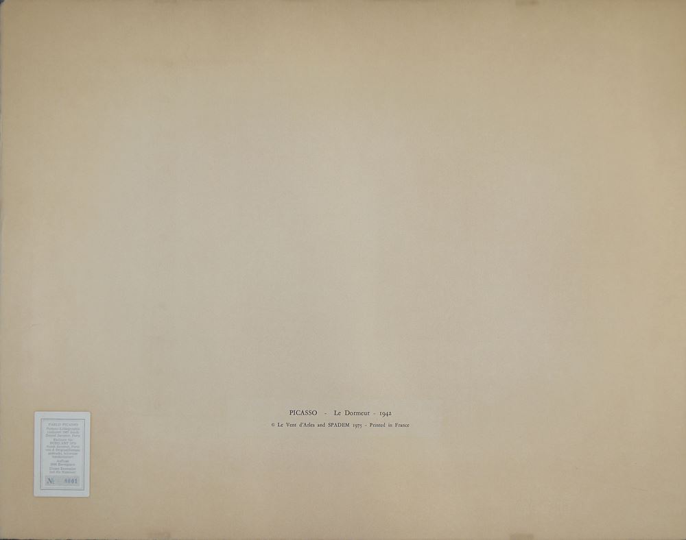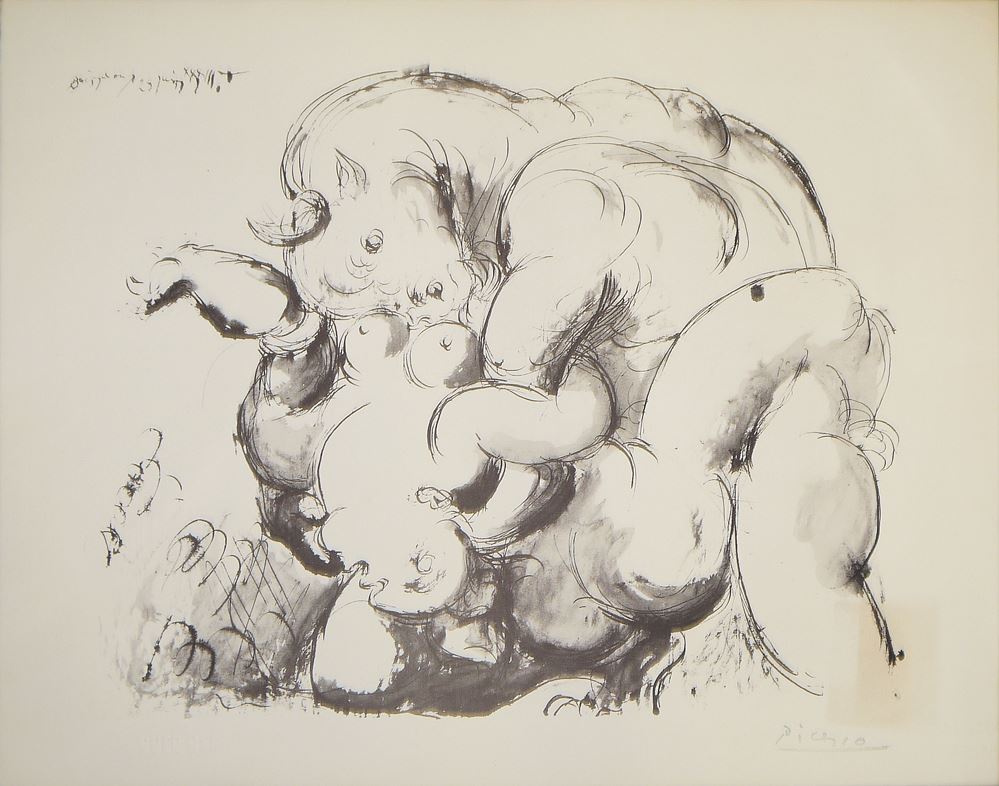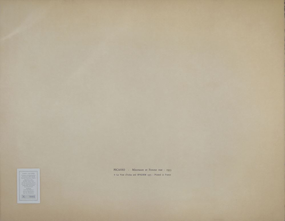0274-Pablo Picasso, nach, “Le dormeur” & “Minotaure et femme nue”, zwei Pochoir-Lithographien, SPADEM 1975, jeweils Nr. 1 von 2000, dazu ein großes Picasso – Plakat “Die Zeit nach Guernica”