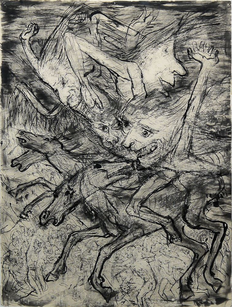 Willi Müller-Hufschmid, 1890 - Karlsruhe - 1966, "Die apokalyptischen Reiter", Tuschzeichnung/Papier, 43,5 x 33,5 cm, auf Karton montiert, unter Glas u. P.p. gerahmt