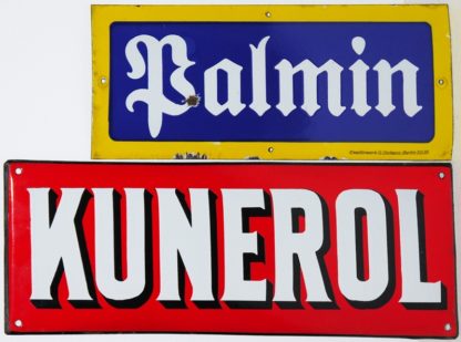 Palmin & Kunerol, 2 Schriftschilder Palmin, Emaillirwerk G. Dichanz, Berlin, Z2+, 18 x 40 cm sowie Kunerol, Z1+, 19,5 x 50 cm