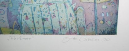 Jutta Votteler, Landschaften & Porträts, 4 signierte Farbradierungen, galeriegerahmt Jutta Votteler, *1959 Ludwigshafen am Rhein, "Kleines Gruppenbild", Farbradierung, 39 x 27,5 cm, sign., dat. 2000, betit., num. 79/120; "Parktor", Farbradierung, 22 x 33,5 cm, sign., dat. (19)90, betit., bez. EA; Häuser mit Palme, Farbradierung, 25,5 x 19 cm, sign., dat. (19)90, bez. EA; "Kleine Konferenz", Farbradierung, 21 x 15 cm, sign., dat. (19)92, betit., bez. EA, alle unter P.p. u. Glas ansprechend gerahmt (einmal Ecke eines Glases fehlend) (Inv. Nr. 30/295/302/303)