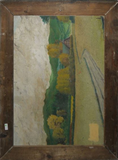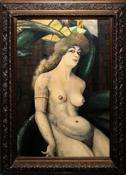 Neusachlicher Maler um 1920/30, Weiblicher Akt und große Schlange im kellerartigen Gewölbe, Öl/Platte, 76,5 x 55 cm, einige Frühschwundrisse im Inkarnat, auf der Rückseite der Platte eine Landschaft, im schweren, kupferfarbenen und reliefiertem Stuckrahmen,