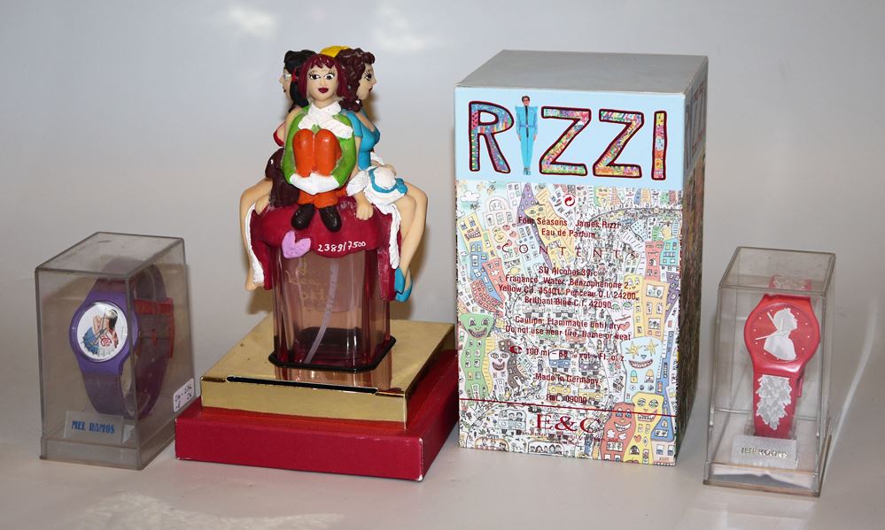 James Rizzi ,1950 - New York City - 2011, 4 junge Frauen sitzen auf einem Parfümflakon, Kunststein, in 15 Farben handbemalt, H 18 cm, num. 2389/7500, Edition Les beaux arts, mit Zertifikat und Originalschachtel, dazu Jeff Koons, *1950, US-amerikanischer Künstler, "Chaos watch edition" Nr. 6 von 1992, num. 1318/9999 & Mel Ramos, 1935 - 2018, US- amerikanischer Pop art- Künstler, "Chaos watch edition" Nr. 1, auf dem Armband sign., beide in den originalen Plexiglasboxen