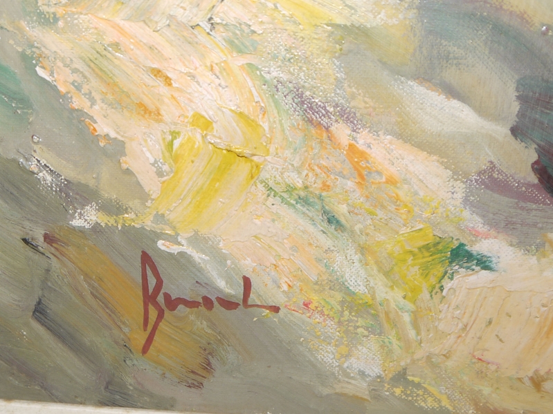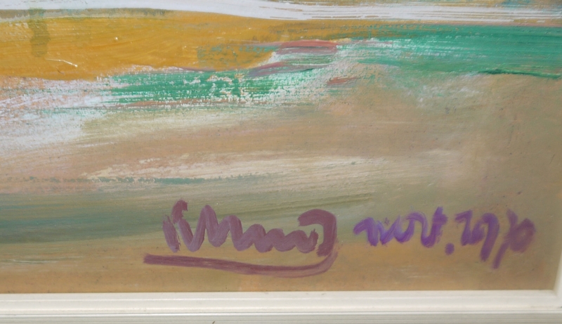 Karl Unverzagt, 1915 - Grünstadt - 2007, bis 1937 Studium an der Akademie der Bildenden Künste Karlsruhe, Moschellandsburg bei Obermoschel, Öl/Lw./Platte, 79,5 x 119 cm, sign., dat. 1989, gerahmt; Paul Wolfgang Schmidt, Neustadt, Südliche Landschaft in kräftigen Farben, Öl/Platte, 49 x 66 cm, sign., dat. 1969, unleserlich betit. "... mimosa", gerahmt sowie Obermoschel mit Blick auf die Kirchtürme, Öl/Platte, 60 x 80 cm, sign., dat. 1970, gerahmt; Unleserlich signierender Künstler, "Bauer mit Kühen" & "Bauer mit Pferden", 2 große Ölgemälde/Lw., pastoser Farbauftrag, 60 x 80 cm, je sign. B..., verso betit., gerahmt