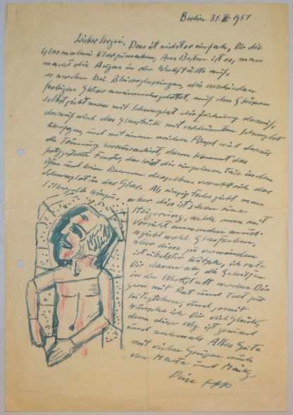 Max Pechstein, 1881 Zwickau - 1955 West-Berlin, bedeutender deutscher Maler, Grafiker und Mitglied der Künstlervereinigung „Brücke“, Brief mit Ausführungen zur Glasmalerei und einer Zeichnung, Papier/Tinte/Buntstift, dat. 31.III.1951, monogr., mit Knickfalten u. gelocht.