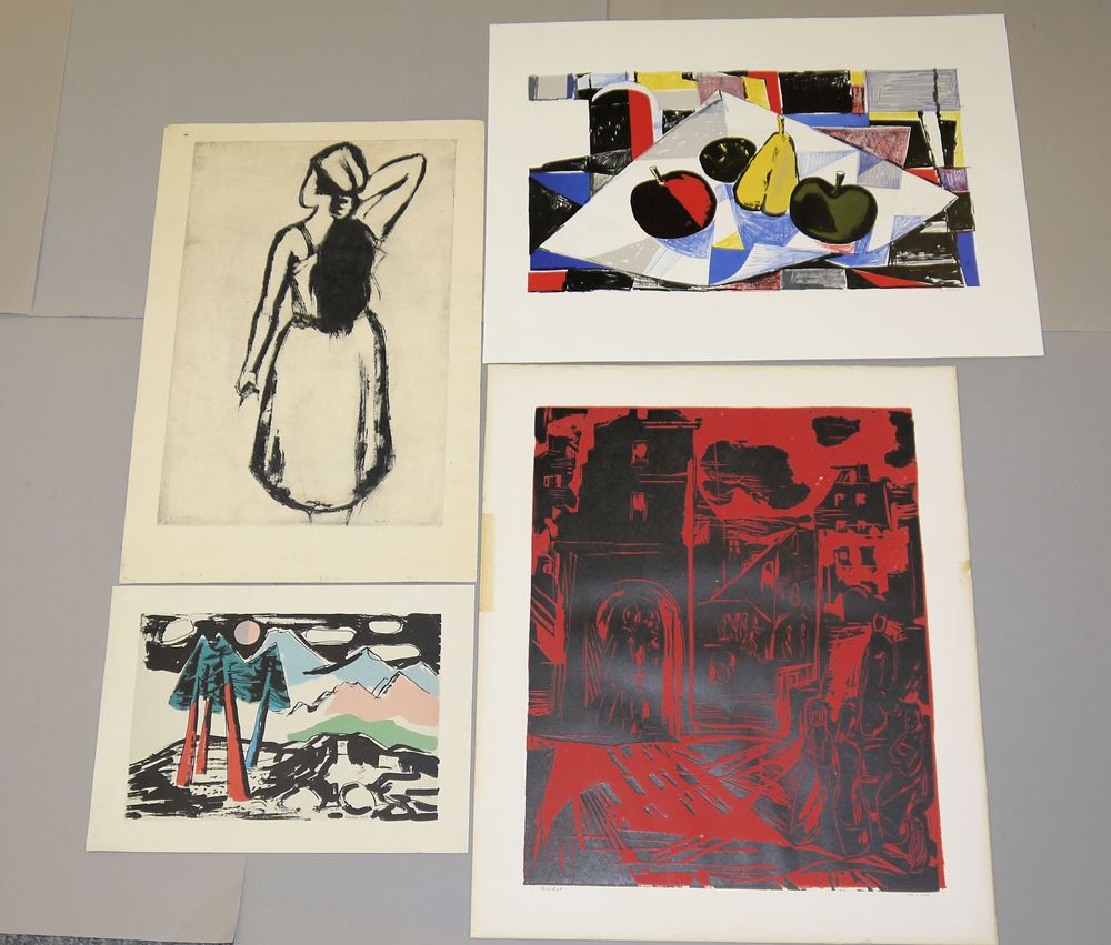 Karl Rödel, 1907 Neu-Isenburg - 1982 Mannheim, Liebespaar in romantischer Kulisse, Farbholzschnitt, 50 x 69 cm, signiert; Landschaft mit Bergen, Farblithographie, 21 x 31 cm, signiert, datiert 1951; Rückenansicht einer Frau, Radierung, 47 x 30 cm, signiert; Figürliche Szene, Farbholzschnitt, 50,5 x 40,5 cm, signiert, nummeriert 14/100; Stillleben, Farblithographie, 28,5 x 49,5 cm, signiert, Blätter mit unterschiedlichen Zuständen, Selbstbesichtigung empfohlen