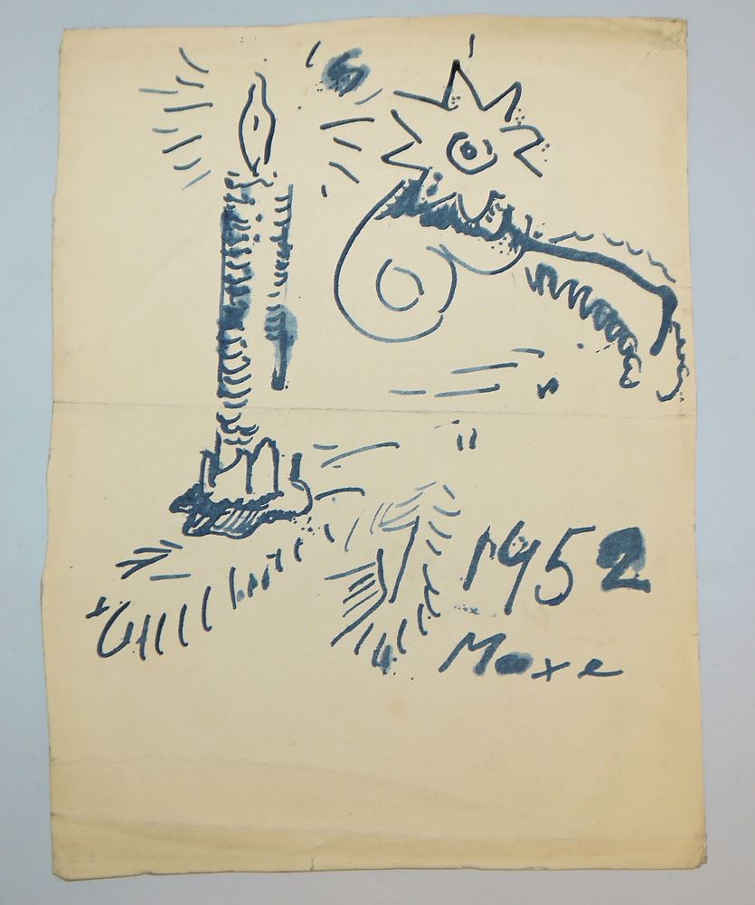 Max Pechstein, 1881 Zwickau - 1955 West-Berlin, bedeutender deutscher Maler, Grafiker und Mitglied der Künstlervereinigung „Brücke“, Weihnachtskarte für Sergei Peters mit Kerze, Stern u. Zweigen, Papier/Tinte, sign. Maxe u. dat. 1952, gefaltet u. am Rand beschnitten