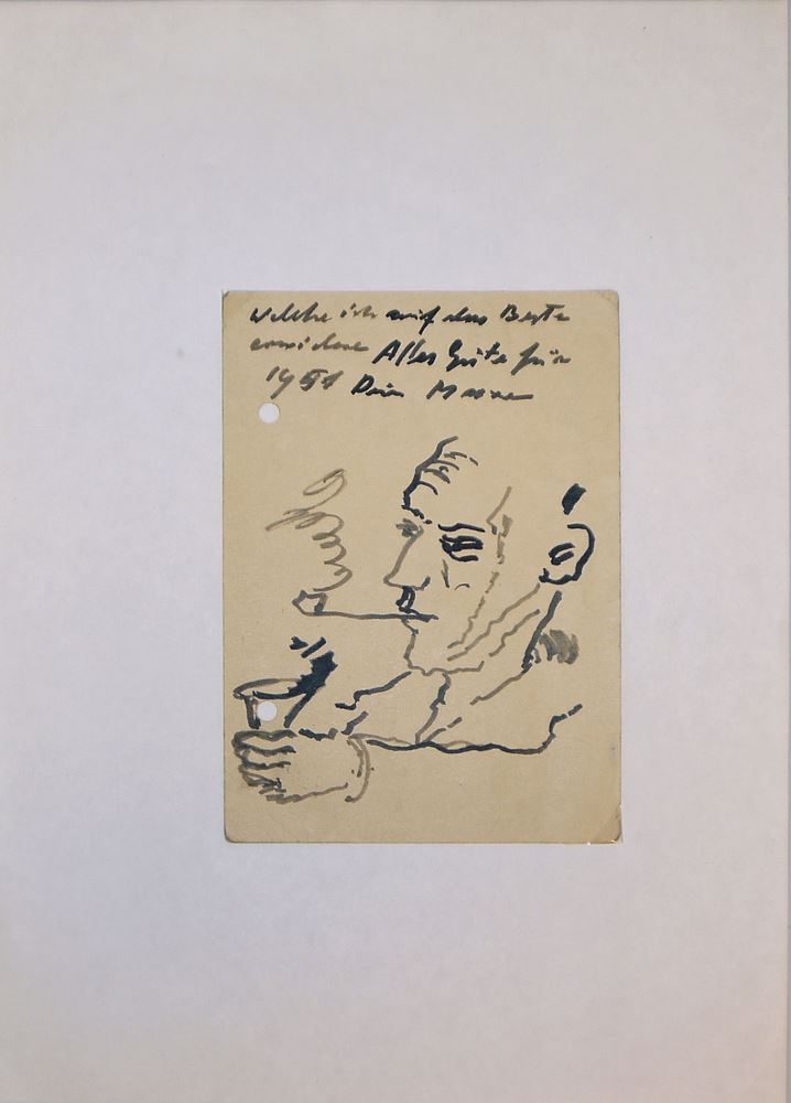 0309-Max Pechstein, Postkarte mit gezeichnetem Selbstportrait mit Pfeife, 1950