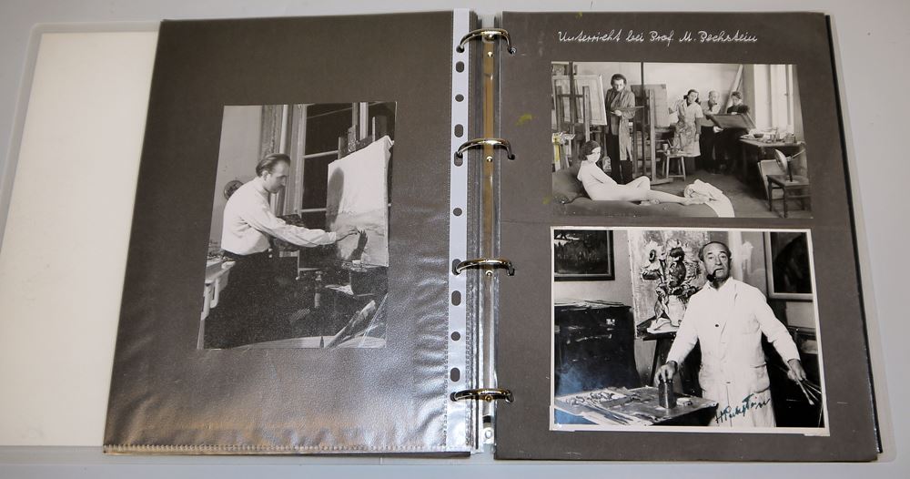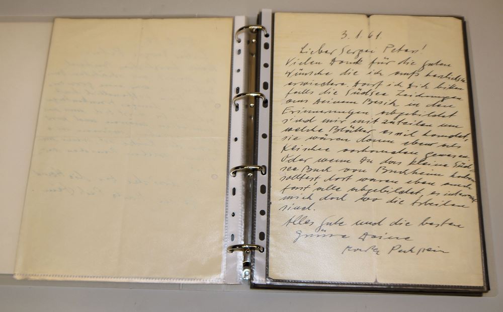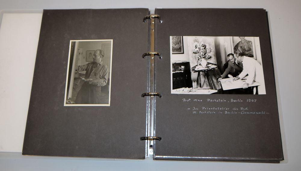 Sammlung von sechs Briefen aus den Jahren 1947 bis 1961, darunter drei Briefe Pechsteins an Peters, zwei Briefe von Marta Pechstein an Peters und einen Brief von Peters an Pechstein, dazu drei von Pechstein sign. Monographien: Ausstellung HMPechstein, Magistrat der Stadt Berlin, 1946; Max Pechstein von Georg Biermann, 1919; Max Pechstein und der Beginn des Expressionismus, hrsg. v. K. Lemmer, mit Widmung für Peters, dazu ein Album mit Dokumenten und Fotografien, u.a. Künstlerausweise, von Pechstein sign. Fotos usw.