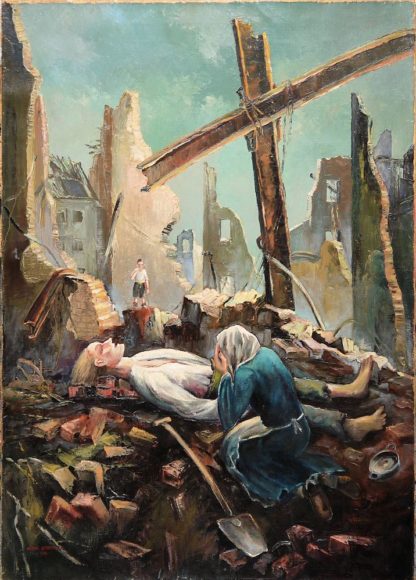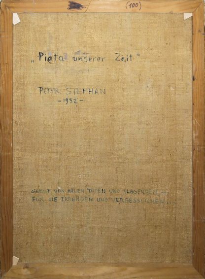 Peter Stephan, bürgerl. Sergei Peters, 1916 in St. Petersburg, Russland - 1974 Aschau, deutscher Maler, das Gemälde "Pieta unserer Zeit" gehört zu den Ruinenbildern, aufgrund derer der Künstler den Namen „der Trümmermaler“ erhielt, es zeigt eine Szene in den Trümmern von Berlin. Ein Leichnam wird, in auf Trümmern liegend, von einer knieenden Frau mit Kopftuch beweint. Ein aus kaputten Stahlträgern geformtes Kreuz überragt die Szene. Im Hintergrund ein mit einer Spielzeugkanone spielendes Kind, das auf Mauerresten steht und dessen Augen ganz leer sind. Ausdrucksstarkes Ölgemälde mit teils pastosem Farbauftrag, Öl/Lw, 101 x 80 cm, u. li. sign. u. dat. 1952, verso bez. u. Text "Gemalt von allen Toten und Klagenden - für die Irrenden und Vergesslichen...", ohne Rahmen