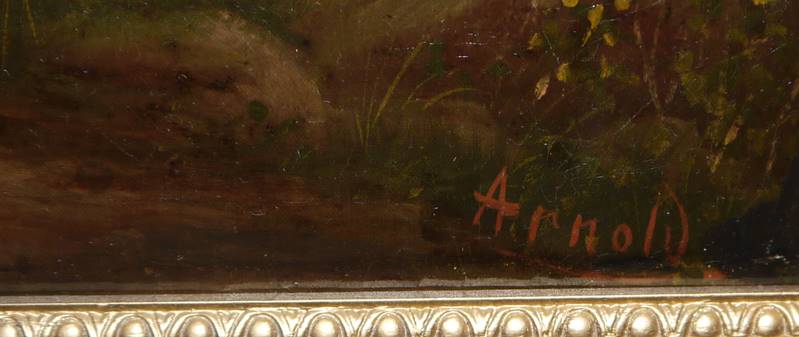 Friedrich Adolph Arnold, wohl, 1831 Zeulenroda - 1862 Florenz, ab 1853 Studium an der Dresdner KA, ab 1857 Schüler bei Ludwig Richter, zwei Seenlandschaften mit Figurenstaffage (Sächsiche Schweiz ?), umstanden von mächtigen Bäumen, Öl/ Lw, je 50 x 75 cm, Lw. altgefirnisst und teilw. fleckig, jeweils r. u. sign. Arnold, beide in gleichen Goldstuckrahmen