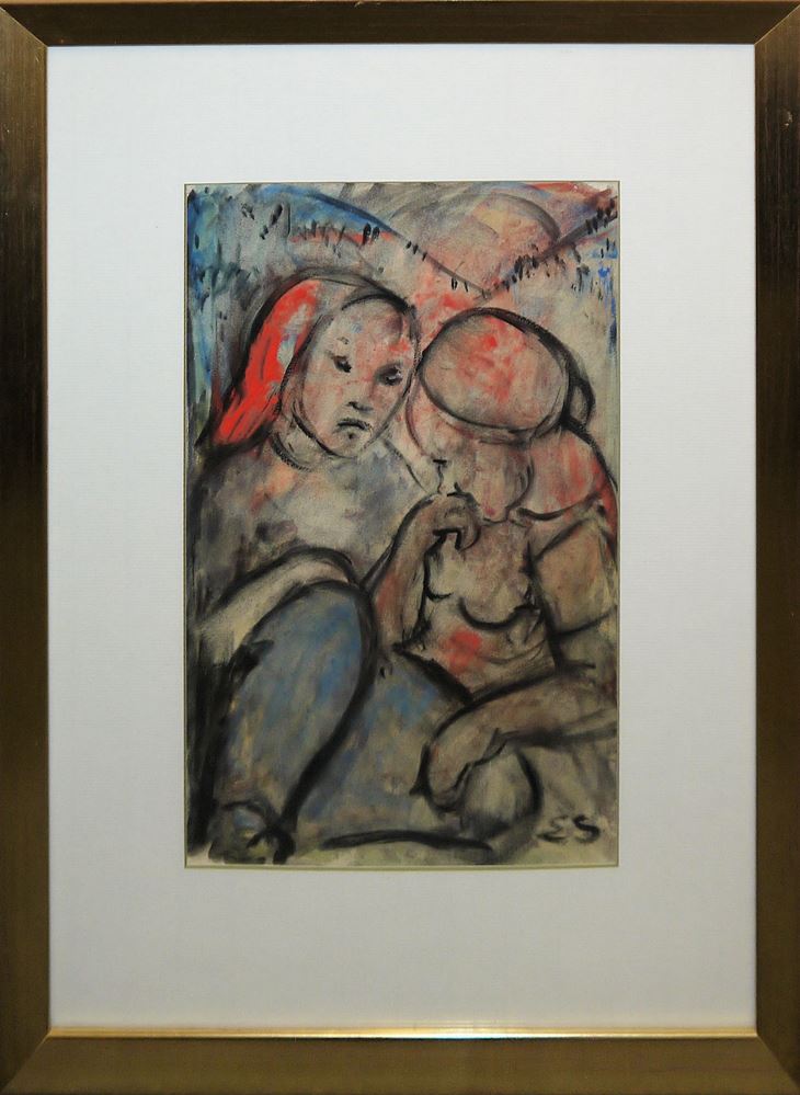 Elisabeth Schmitz, Zwei Frauen, Aquarell, gerahmt Elisabeth Schmitz, 1886 Kestenholz (Elsass, heute Châtenois) -1954 Düsseldorf, Malerin u. Grafikerin, zwei sich einander zugewandte sitzende Frauen, Aquarell, ca. 35 x 23 cm, monogr., unter Passepartout und Glas gerahmt. Zur Künstlerin: Elisabeth Schmitz studierte an der Kunstgewerbeschule in Straßburg. Ihr Werk war anfangs vom Expressionismus geprägt, bevor sie sich der Neuen Sachlichkeit zuwandte. Häufig beschäftig sie sich mit dem Thema Weiblichkeit und entwickelt einen von der Madonnen- und Ikonenmalerei inspirierten eigenen Ausdrucksstil.