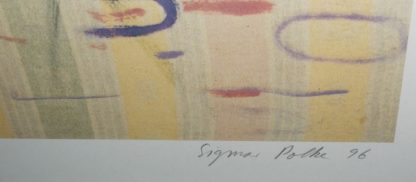 Zum Künstler: Polke studierte ab 1961 Gerhard Hoehme und Karl Otto Götz an der Kunstakademie Düsseldorf .1963 gründete er zusammen mit Gerhard Richter und Konrad Lueg den Kunststil Kapitalistischen Realismus. Von 1970 bis 1971 war er Gastprofessor an der Hochschule für bildende Künste in Hamburg und zwischen 1977 und 1991 Professor an derselben Hochschule. Sein Werk umfasst Malerei, Arbeiten auf Papier, Fotografie, Film, Objekte und Grafik. Seine Arbeitsweise zeichnete sich durch eine große Vielfalt und einen unkonventionellen und experimentellen Umgang mit Motiven und Materialien aus.