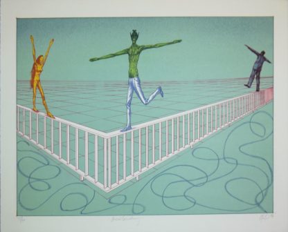 Uwe Pfeifer, *1947 Halle, deutscher Maler und Grafiker, hier: 3 Farblithographien, je 50 x 64 cm: "Dreierbeziehung", "Harlekinade" & "Gevatter Jongleur", je num. 35/60, je sign. u. dat. (19)97 / "Tanz unterm Vulkan", 3tlg. Farblithographie, 70 x 30 cm, 24/115, sign. u. dat. (19)97, gerahmt