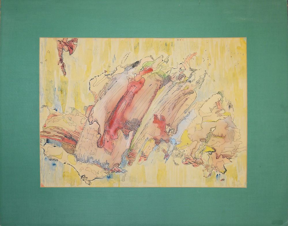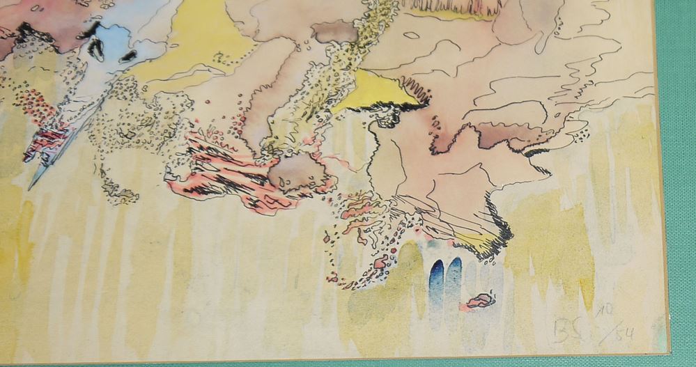 Bernard Schultze, Informelle Komposition, Aquarell/Tusche von 1954 Bernard Schultze, 1915 Schneidemühl - 2005 Köln, deutscher Maler, Vertreter der Kunstrichtung Informel, hier: Abstrakte, informelle Komposition, Tusche/Aquarell, 34 x 47 cm, r. u. monogr. BS u. dat. 10/54, hinter P.partout mit Galerieband alt fixiert Zum Künstler: Bernard Schultze studierte von 1934 bis 1939 an der Hochschule für Kunsterziehung in Berlin und an der Kunstakademie Düsseldorf. Im Herbst 1949 lernte Schultze die Künstlerin Ursula Bluhm (genannt Ursula) in der Zimmergalerie Franck kennen. 1952 gründete er zusammen mit Karl Otto Götz, Otto Greis und Heinz Kreutz die Künstlergruppe Quadriga, die Kerngruppe der deutschen informellen Malerei.