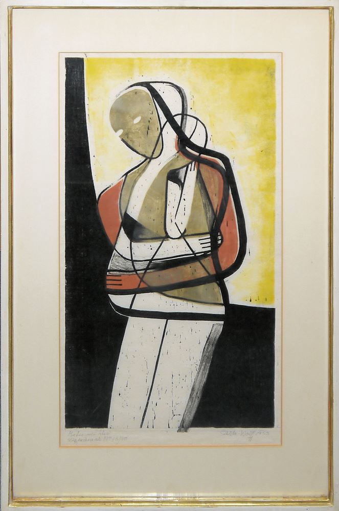 Johanna Schütz-Wolff, 1896 Halle (Saale) - 1965 Söcking bei Starnberg, deutsche Textilgestalterin, Grafikerin und Holzschneiderin, hier: "Mutter und Kind", dem Zeitstil der 1950er Jahre entsprechende, modern-abstrakte Darstellung, Farblithographie, ca. 60 x 34 cm, bez., "Eigendruck 13/502, sign. u. dat. 1953, unter P.partout in schönem Originalrahmen (Gesamt: 80 x 52 cm)