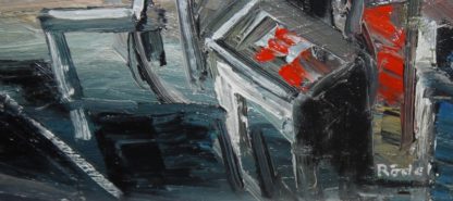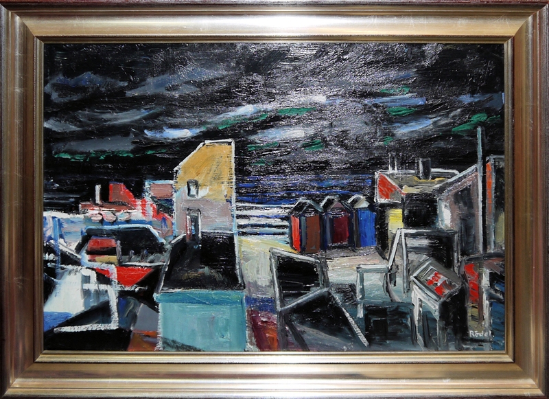 Karl Rödel, 1907 Neu-Isenburg - 1982 Mannheim, ab 1929 Studium an der Kunstgewerbeschule auf der Burg Giebichenstein bei Charles Crodel, Gerhard Marcks und Herbert Probst; 1933-34 Studium an der Akademie zu Leipzig; Studienreisen u.a. nach Italien u. England; ab 1939 Restaurator im Schloss Museum Berlin; 1942 zog er in ein Atelier nach Berlin, welches mit sämtlichen Werken im Krieg 1944 zerstört wurde; ab 1952 ansässig in Mannheim; es folgten Begegnungen mit Willi Baumeister, Nina Kandinsky, Pablo Picasso und Marc Chagall. Hier: Nächtliche Szenerie eines Küstenortes mit Schiff und Strandhäuschen, Öl/Hartfaser, 43 x 64,5 cm, sign., im Silberrahmen