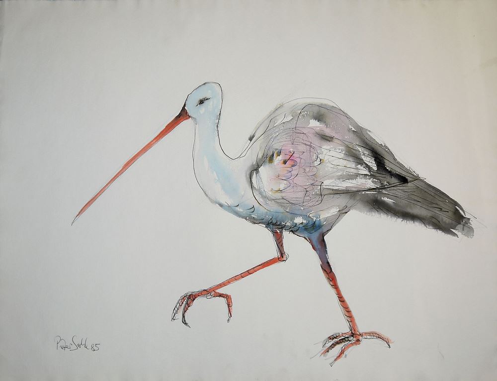 Pieter Sohl, Sammlungsnachlass mit 4 Originalen und 5 Druckgraphiken, alle signiert Pieter Sohl, 1933 Mannheim - 2018 Heidelberg, Storch, Aquarell/Tusche, 57 x 78 cm, signiert, datiert (19)85; Zwei Akte, Mischtechnik/Papier, 57 x 78 cm, signiert, datiert (19)75; "Afrika", Mischtechnik/Papier, 56 x 77 cm, signiert, datiert (19)74, betitelt; Zwei Akte, Farbserigraphie mit Pinsel überarbeitet, 27 x 38 cm, signiert, datiert (19)74, nummeriert 15/20; Landschaft, Farbserigraphie, 37 x 46 cm, signiert, datiert (19)76, mit Widmung 1976; Landschaft bei Nacht, Radierung, 12,5 x 19,5 cm, signiert, datiert (19)85, mit Widmung, bez. E.A.; Bäume, Farbradierung, 20 x 12,5 cm, signiert, datiert (19)82, bez. E.A.; Abstrakte Komposition, Mischtechnik, 12,5 x 17,5 cm, signiert; Baumallee, Litho, Grußkarte, 10,5 x 14,5 cm, o. Rahmen Zum Künstler: älteste Sohn des Kunstmalers Will Sohl. 1952-54 Studium an der Kunstakademie Düsseldorf bei Ewald Mataré, Bruno Goller und Zoltan Székessy. In den Jahren 1964/1965 unternahm er eine Reise in die Vereinigten Staaten. Dort hatte er Begegnungen mit den Künstlern Andy Warhol in dessen Loft in New York und Syl Labrot, mit dem er in dessen Atelier in Connecticut zusammenarbeitete. Von 1966 bis 1968 lebte er Skandinavien. Dort arbeitete Sohl im Design für Silbergerät und Emaillearbeiten, unter anderem für die Firma Georg Jensen, die führende Silberschmiede Dänemarks. 1968 ließ er sich dauerhaft in Heidelberg nieder und arbeitete als freischaffender Maler und Bildhauer. Ab 1979 lebte er im Heidelberger Kohlhof.