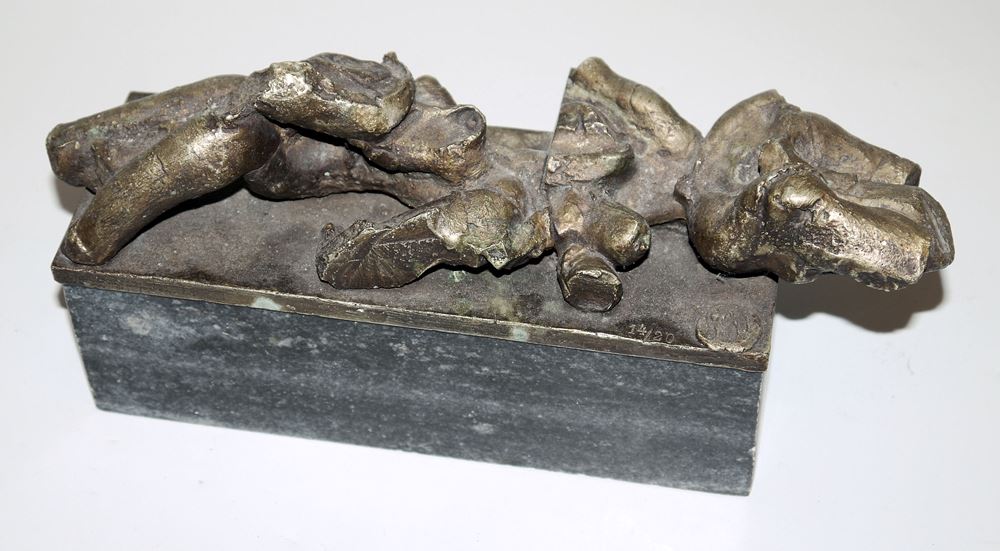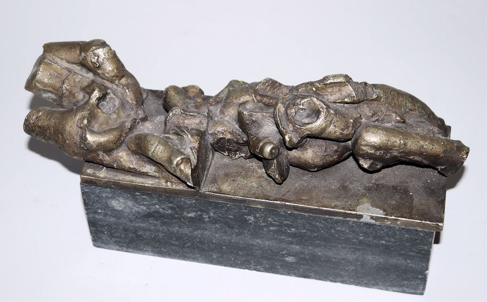 Rolf Szymanski, 1928 Leipzig - 2013 Berlin, Bildhauer, "Kleines Spielkartenbild III", Bronzeplastik mit goldbrauner Patina, L 26 cm, monogr., num. 14/20, auf Marmorsockel, dazu Figur, Radierung, 21,5 x 7 cm, sign., num. 24/30 cm, hinter Glas gerahmt