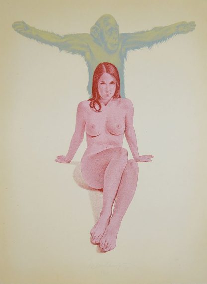 Mel Ramos, Chimpanzee, signierte Farbserigraphie von 1971 Mel Ramos, 1935 Sacramento, Kalifornien - 2018 Oakland, Kalifornien, amerikanischer Künstler und bedeutender Vertreter der Pop Art, hier: Weiblicher Akt mit Schimpansen, Blattmaß 81 x 61 cm, sign., dat. (19)71, num. 98/125, o. Rahmen